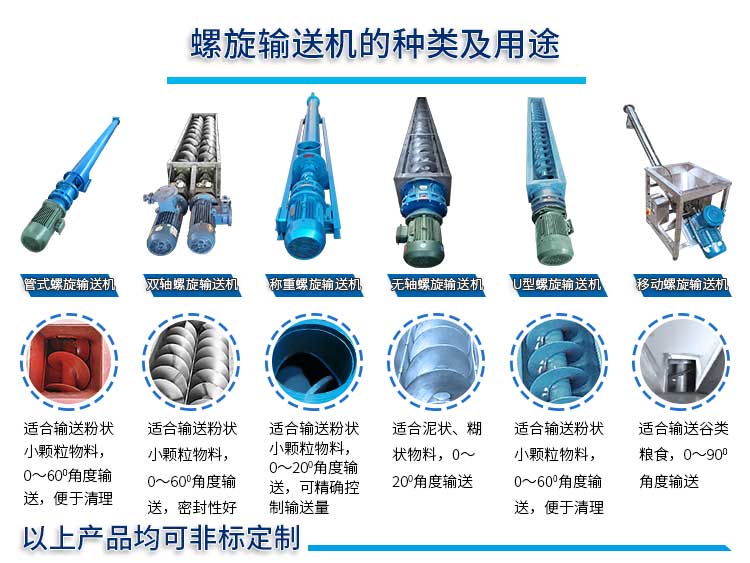 不銹鋼螺旋輸送機型式可分為LSY螺旋輸送機(管式),LS螺旋輸送機(U型),GX螺旋輸送機(U型),LC垂直螺旋輸送機及WLS無軸螺旋輸送機,其結構型式及設計參數可參考其他螺旋輸送機的介紹頁面。