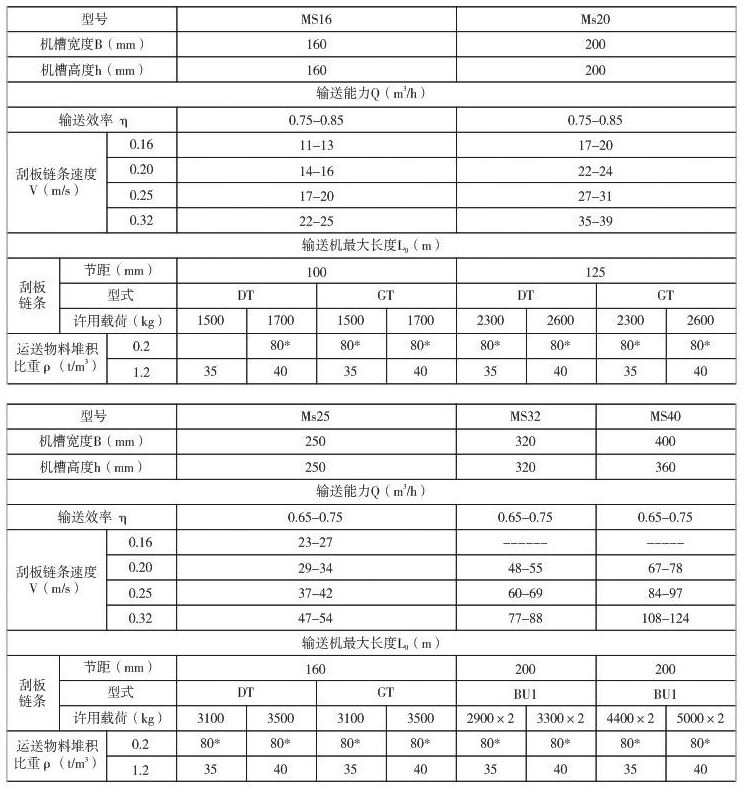 MS型埋刮板輸送機技術性能表: